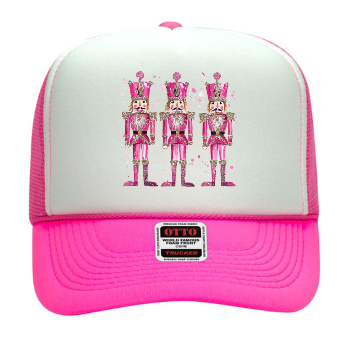 Bright trio of nutcrackers on a bright pink & white trucker hat. SO CUTE!