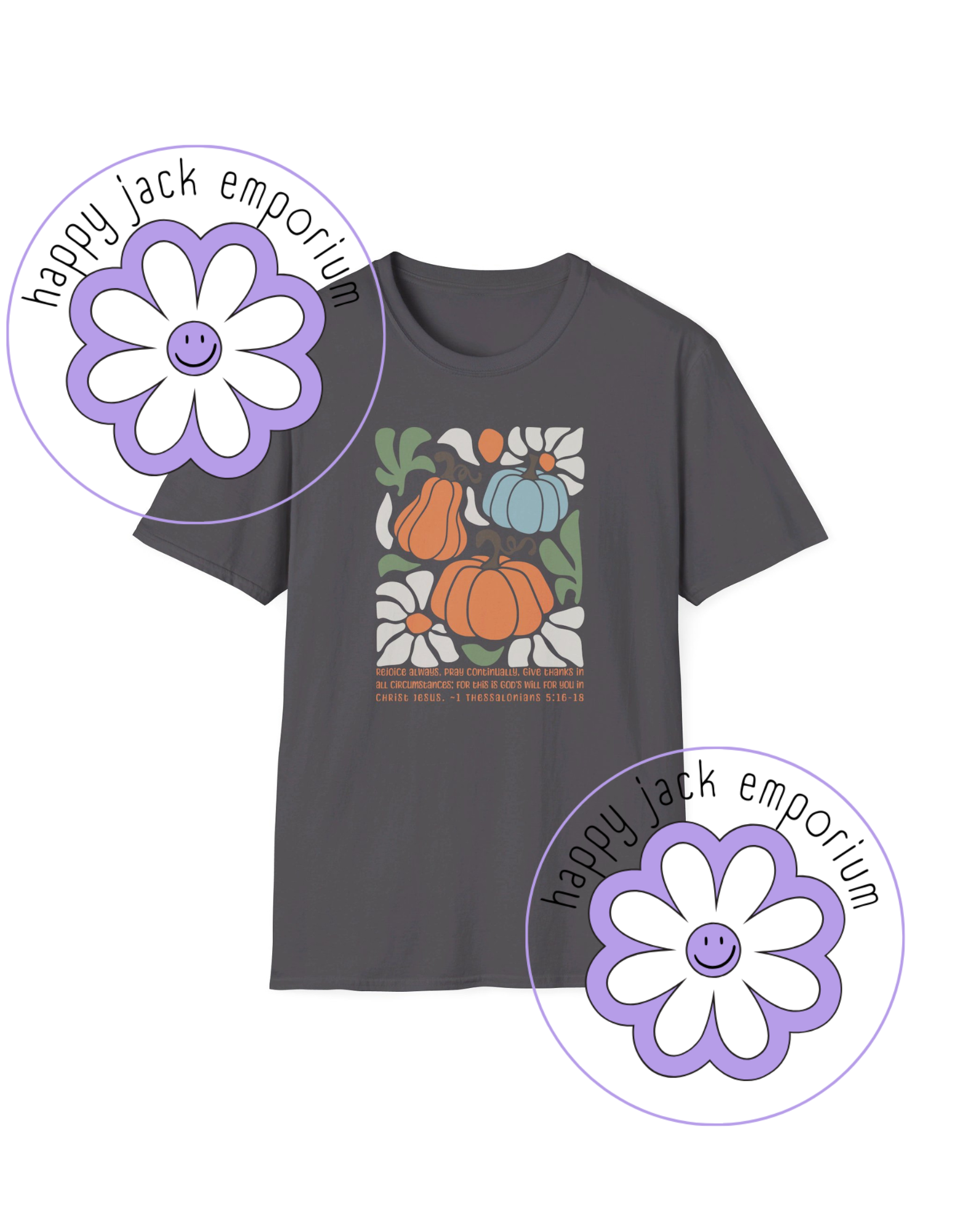 Sweet design with whimsical flowers and pumpkins paired with a beautiful scripture from 1 Thessalonians 5:16-18. Super Soft Gildan shirt. Available in youth and adult sizes